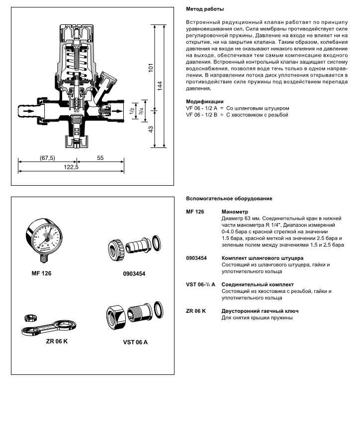 В клапане совмещены регулятор давления, обратный клапан и запорное устройство. Возможно подключение манометра.